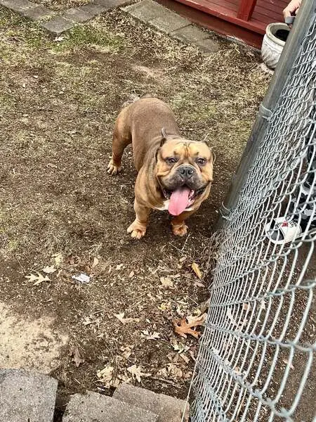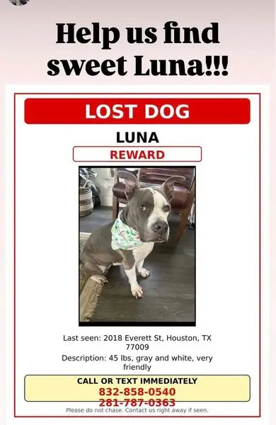 Beige coat with white patches on the chest and head, hazel/tan eyes. ~80 lbs. Red and black 'Emotional Support' harness. Calm, a little skiddish, very headstrong on walks