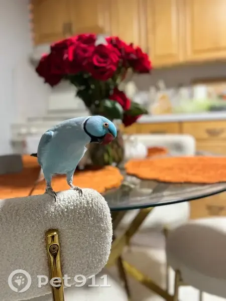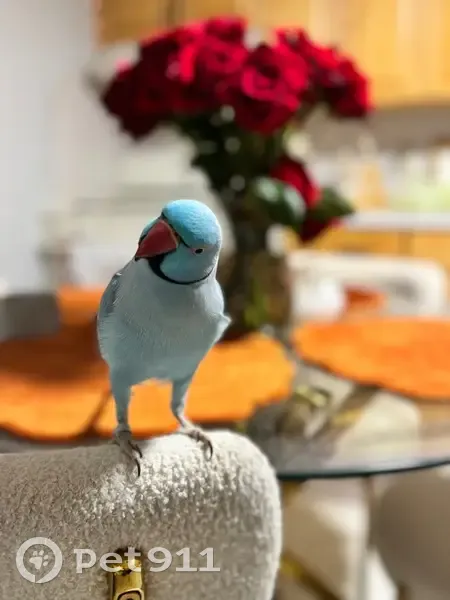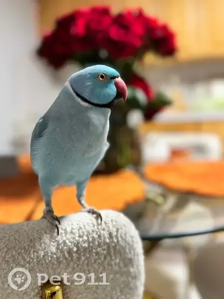 He is a blue indian ringneck He loves when you call him Blue or Peku He likes to say ‘Huuh’ what are you doing, beep beep, he also loves to call out to me and say come here. He is a sweet sweet parrot likes to sit on my shoulder or my head he loves attention. He is scared of noises or hate anything that is loud. He has a silver band on his foot. PLEASE please help me find him i am ready to reward . Its so cold outside and he is scared of other burds and may not have anything to eat
