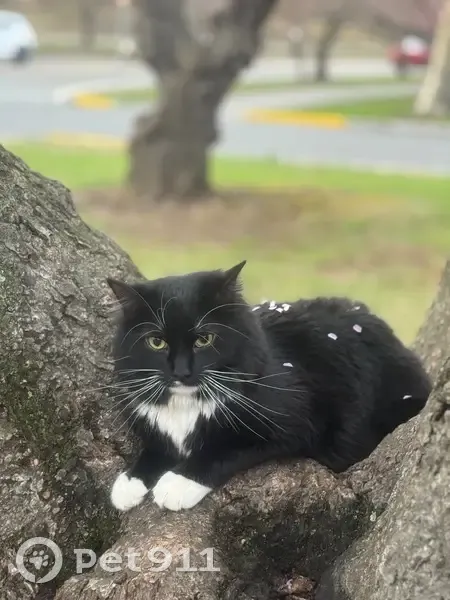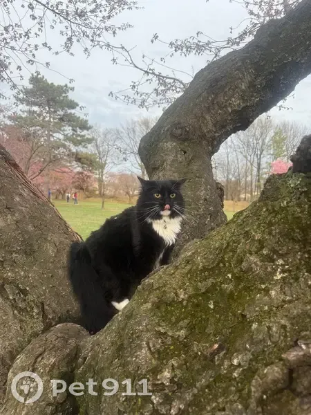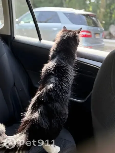 Hes a big boy about (14lbs+) tuxedo domestic long haired cat with white paws . Age-2 years old(Black and white ) Neutered and microchipped. Cat collar- NO