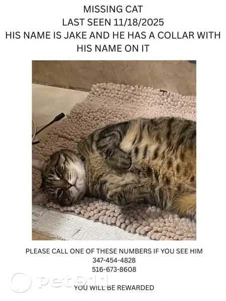 Half bengal so he has brown stripes , he has a lazy left eye so it’s a little smaller than the other, collar on neck with Jets charm , he’s an indoor cat and doesn’t go out so he somehow slipped out the front door ,