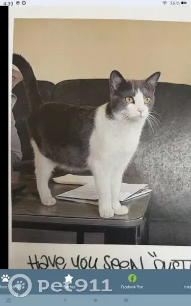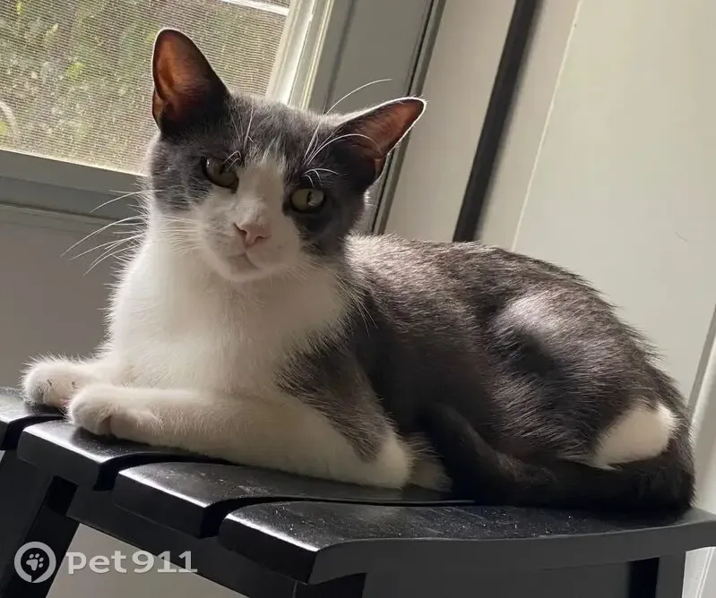 White and dark gray, pink nose, amber eyes, about one year old. Had kittens in may 2025 and was spayed after that. Got out the door without her collar. Friendly and vocal.