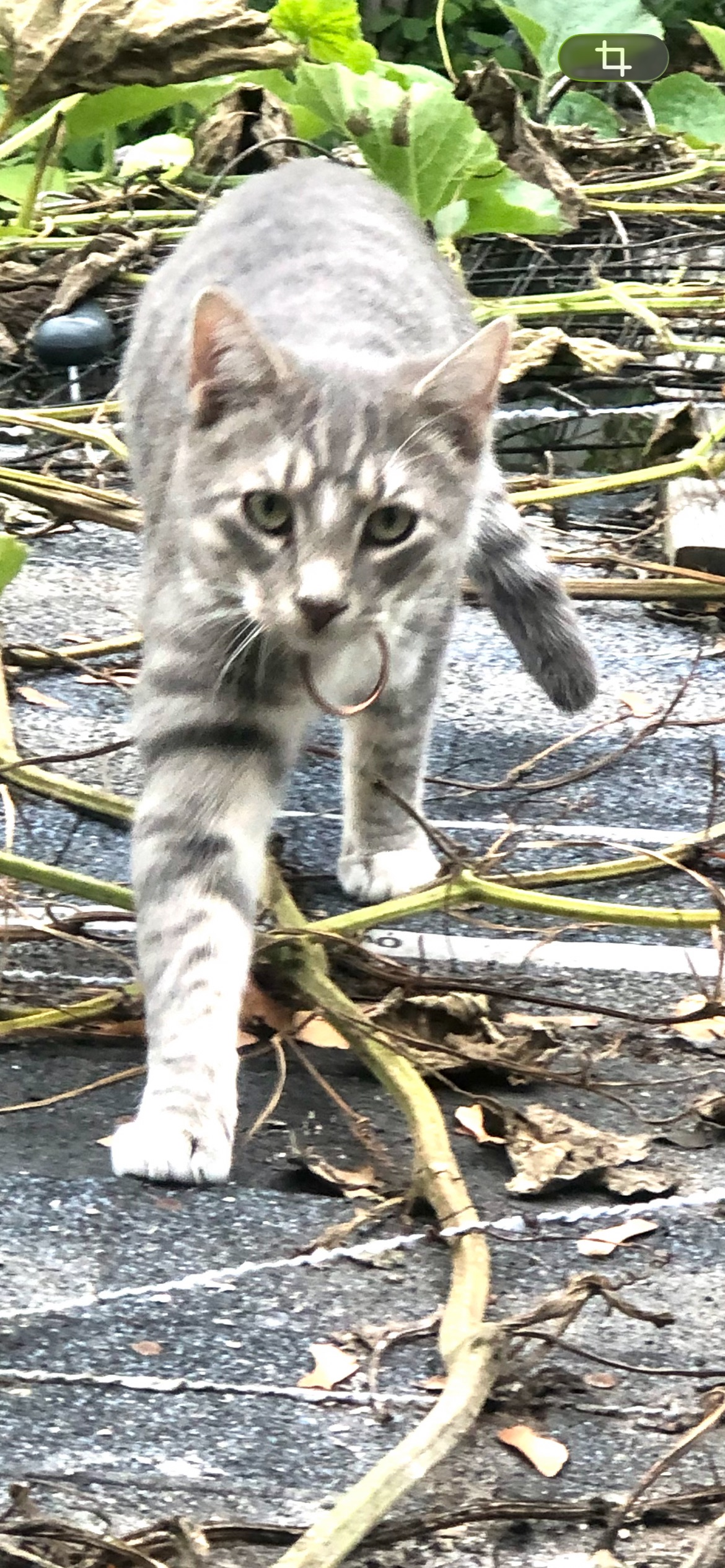 He is a male tabby cat about 11 months old. He has white paws pink ears medium grey and white stripes. He doesn’t have any collar on. He’s friendly and responds to the name Aash.