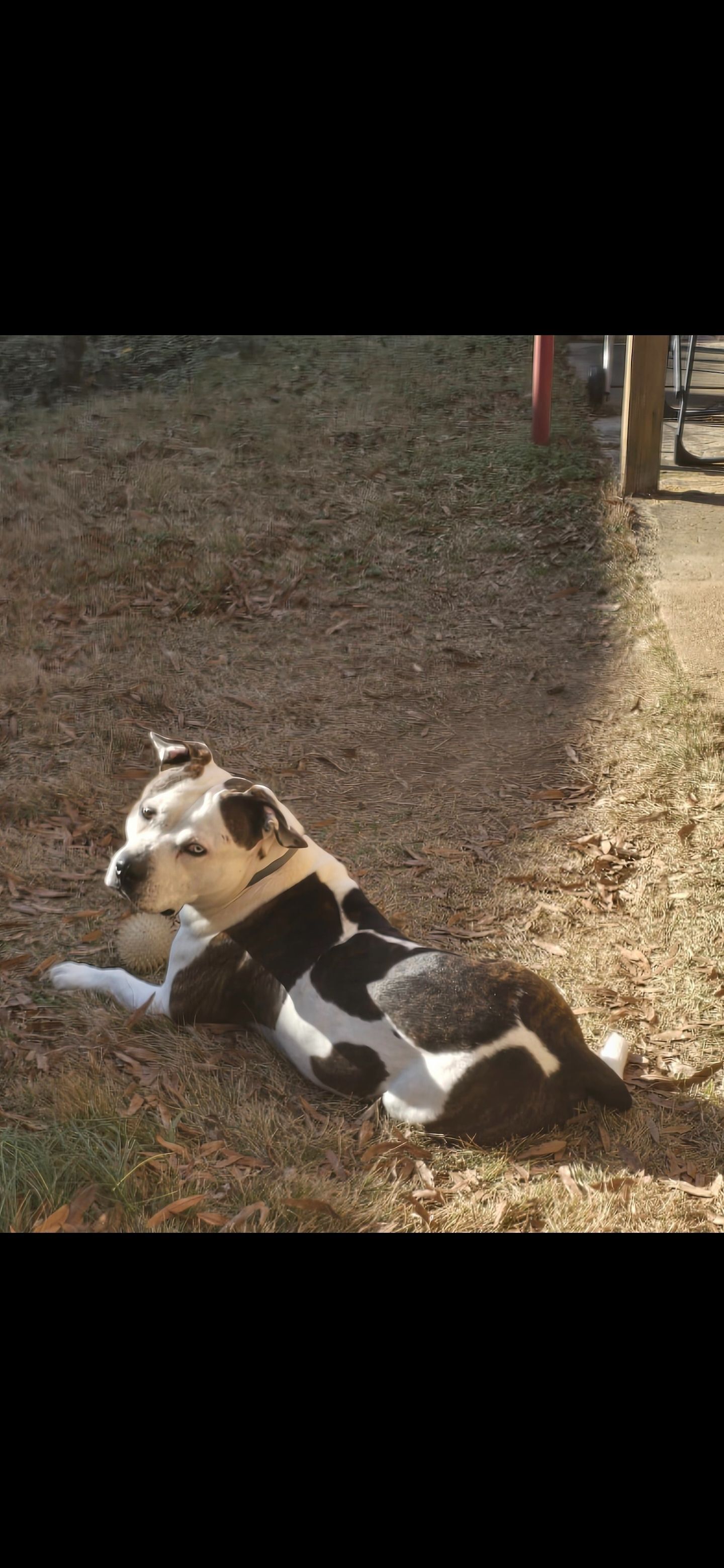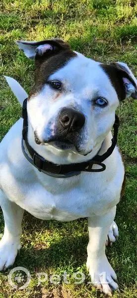 White with brindled spots and patches black Kong collar with he's name tag with my number on it he's super friendly and sweet he got out of the back