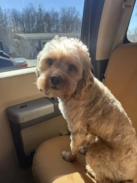 Tan coat, wearing a red sweater. She has a plaid collar with no tag. She bolted out the door while being approached by a stranger at a family members home.