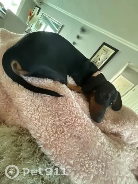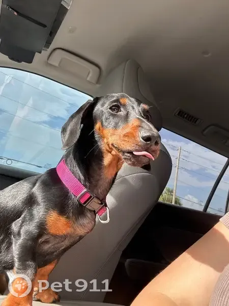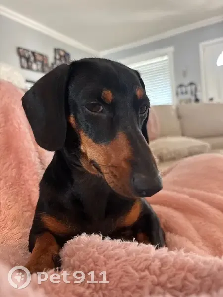 She has no collar on she is 1 year old and a dark brown with a caramel brown hair color so a basic dachshund and she dug a hole in the backyard near the fence and she got through and ran away