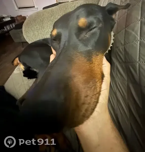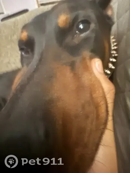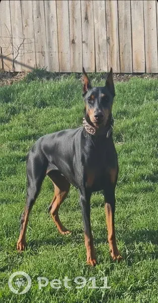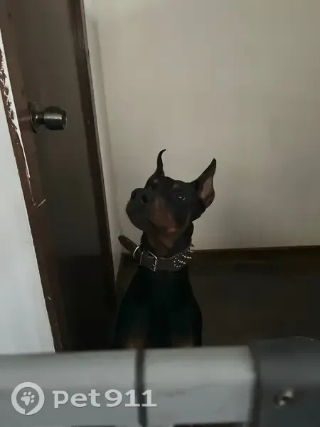 Has pointy ears, a stubby tail, a spiked collar, and a burn scar on his leg from when he was little. Is very friendly and likes people, will respond to calling