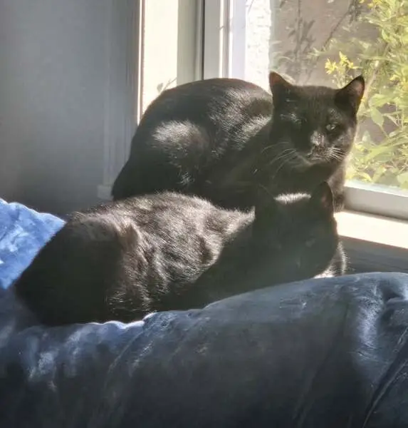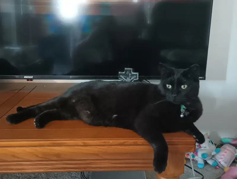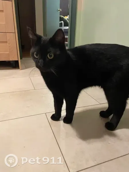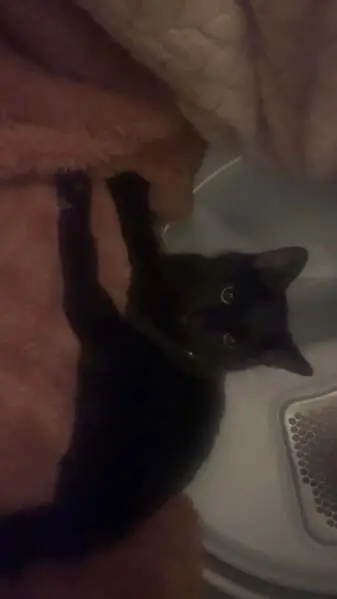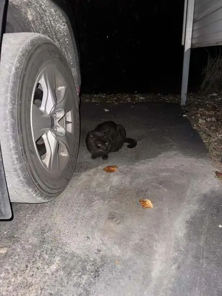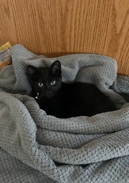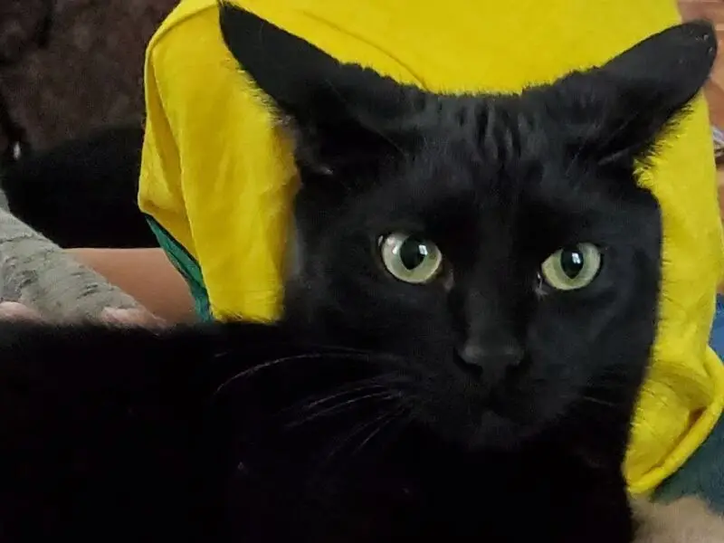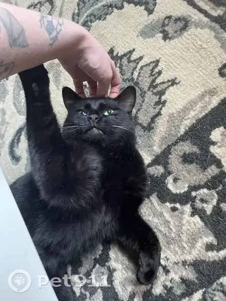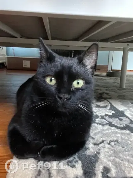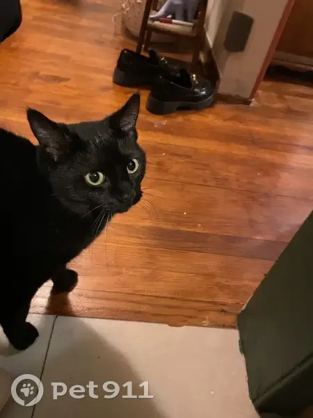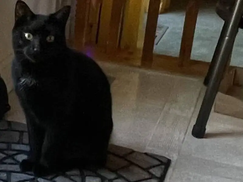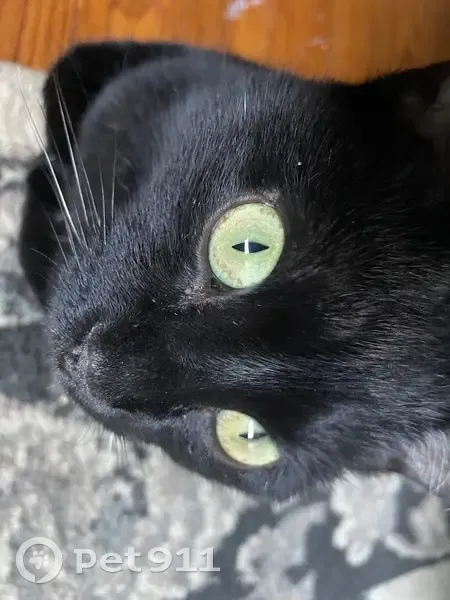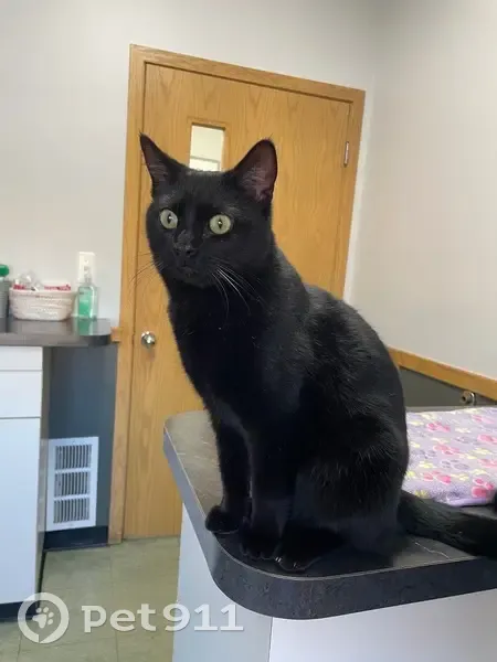 All black, green eyes, has microchip, name is Sasha. Vet has left a message to owner and spoke to emergency contact about finding their cat but we have not heard back despite the vet giving them my number. She was meowing like crazy in my yard a month ago and then again the other night. She’s very friendly and talkative. Seems healthy other than some dandruff.