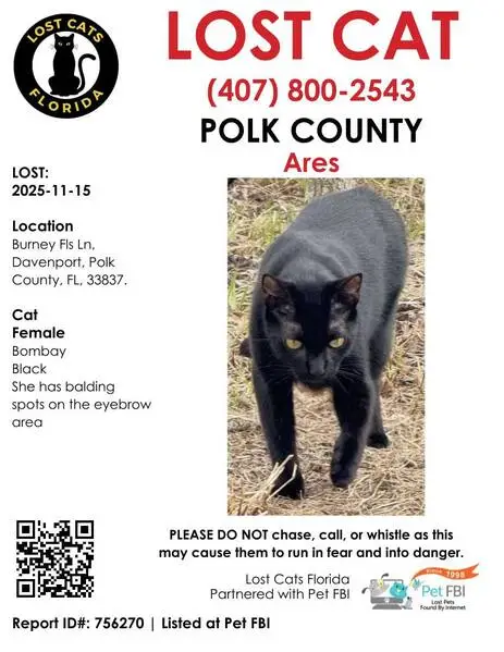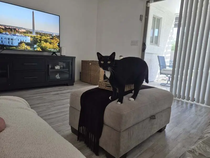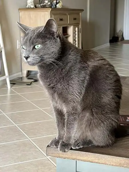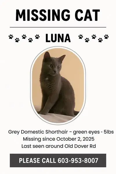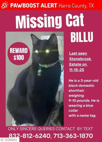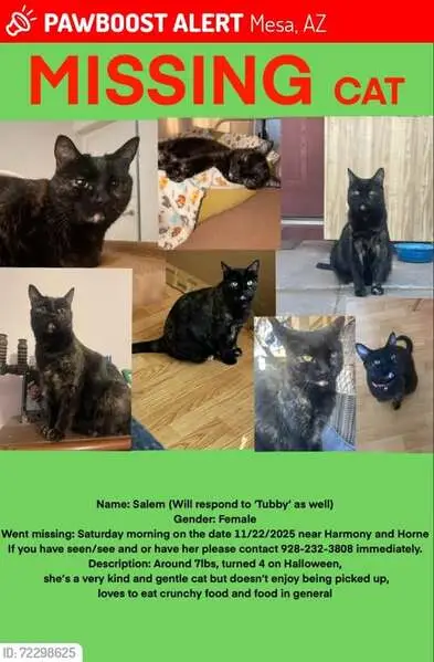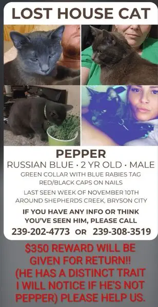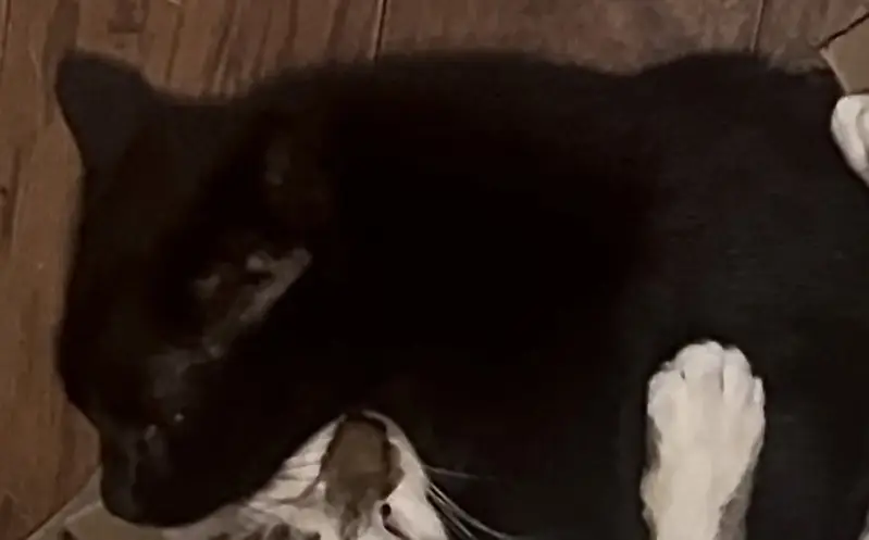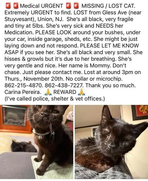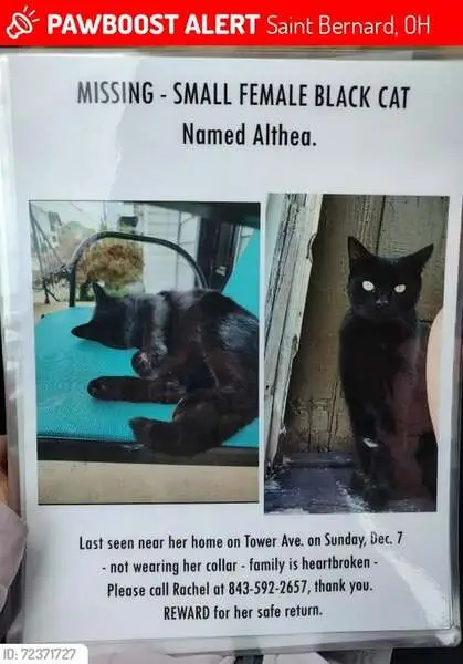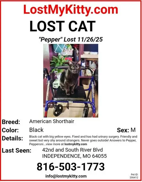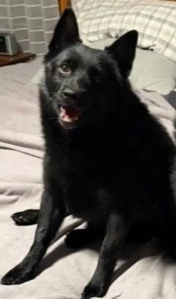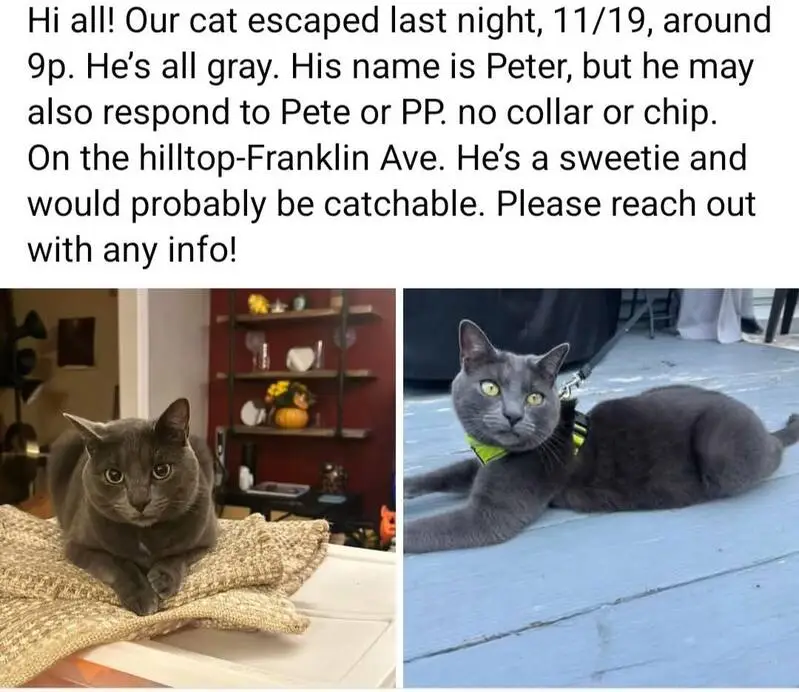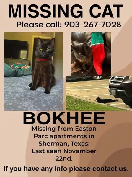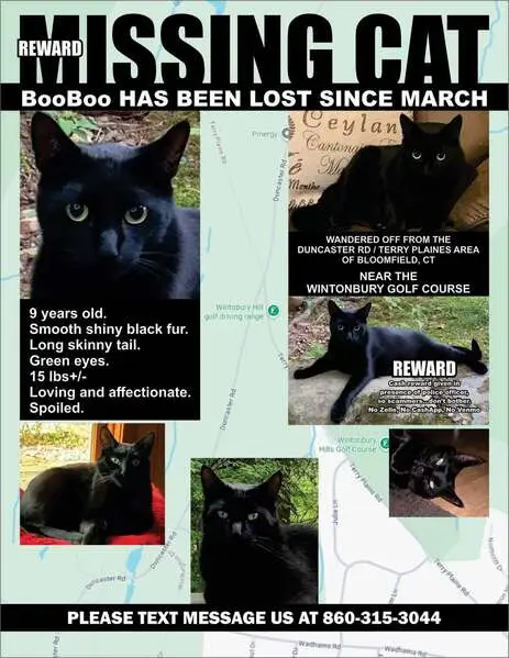 All black, green eyes, has microchip, name is Sasha. Vet has left a message to owner and spoke to emergency contact about finding their cat but we have not heard back despite the vet giving them my number. She was meowing like crazy in my yard a month ago and then again the other night. She’s very friendly and talkative. Seems healthy other than some dandruff.