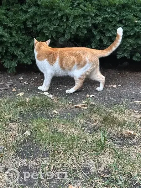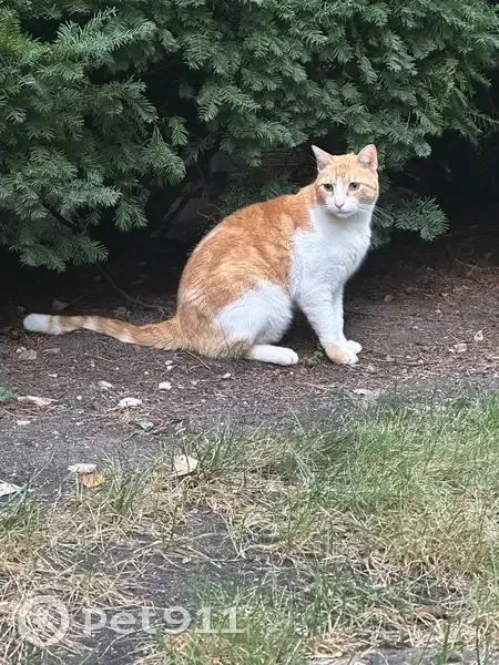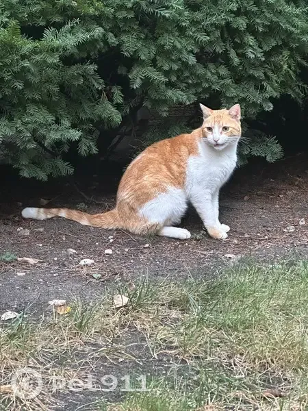 The cat was hiding under a bush and meowed at me when I walked by. I stopped to say hello and they ran toward me and sniffed, but went back under the bush when they saw I didn’t have food. They stayed there meowing loudly for several minutes. They seem really chill and healthy so I’m not sure if they’re lost or just an outdoor cat with no collar.