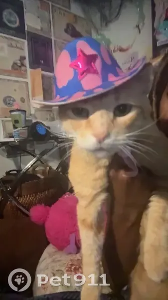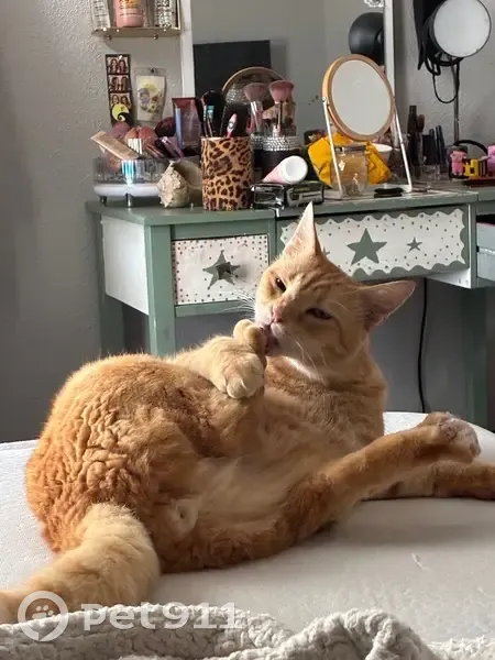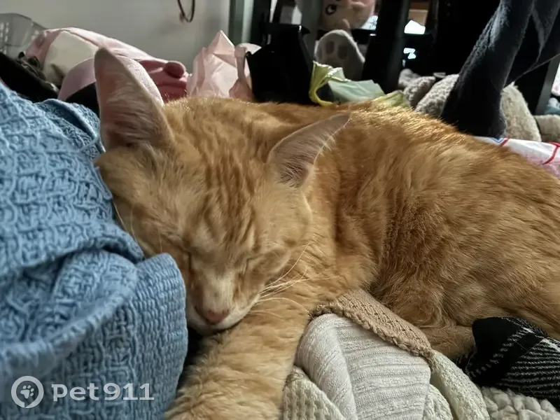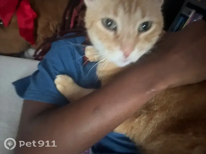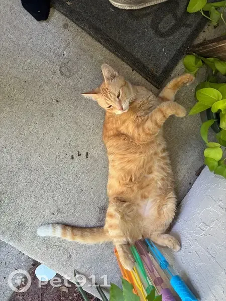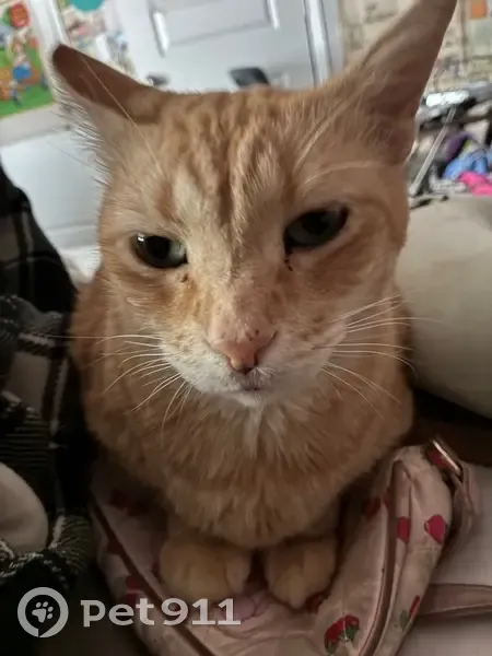 He’s a medium sized cat, green/gray eyes, Orange fur, Tabby pattern. His nose is a baby pink, and his mouth is white. His tail has stripes of white on it the tip being white.