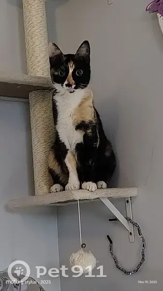 She is a Calico with unusual markings one ear is white the other black. She has black spot on her chin and side of mouth. And her marking on her forehead looks like a hand flipping the bird. I just very recently had major spinal surgery and was left with a friend. Tesh just recently had surgery herself to be spayed. She managed to escape out a window. She is registered as my emotional support animal.