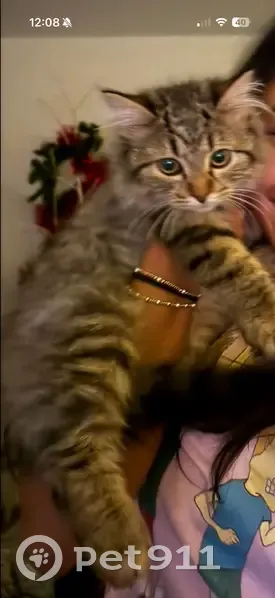 Azland (Azzy) is a 5 month old kitten that is a long haired mix. He has dark brown/black fur on the back of his two back legs. He looks like a fuzzy tabby. With green round eyes.