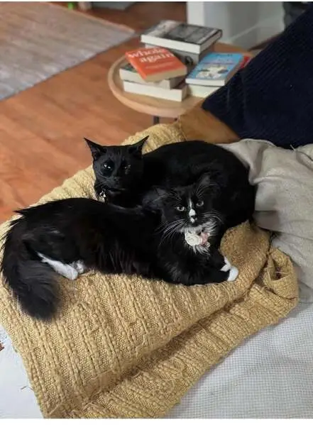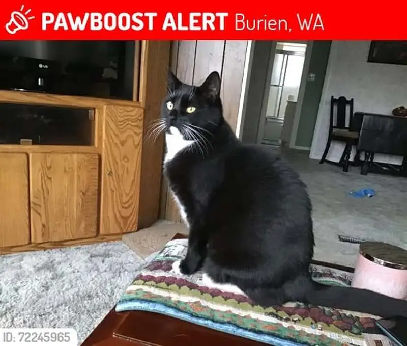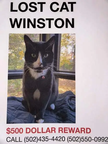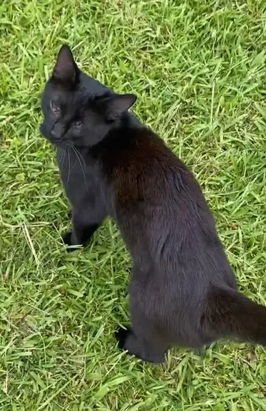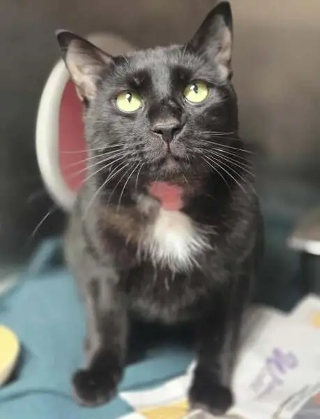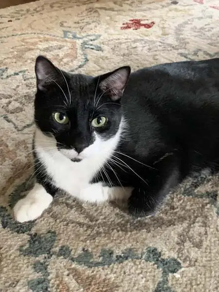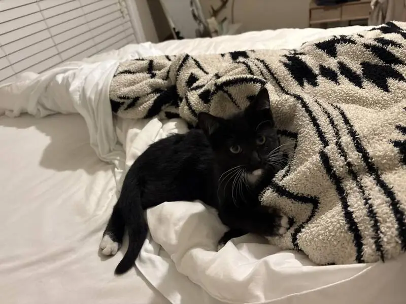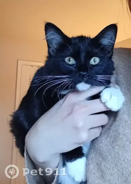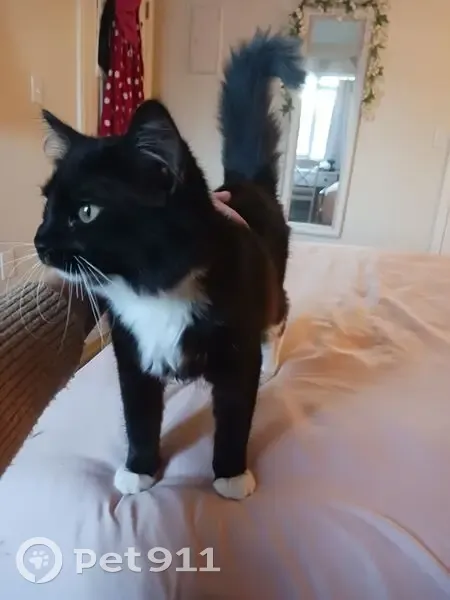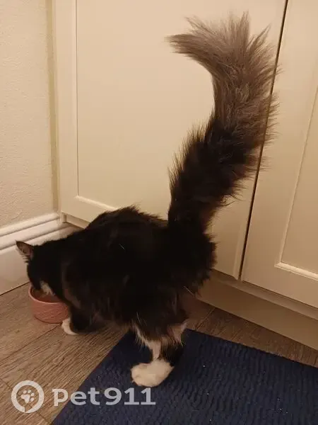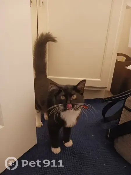 Black and white, salt-and-pepper coloring on top of tail, small (maybe 4-6 months old). Found outside apartment building, meowing and seeming lost. No collar, no microchip.
