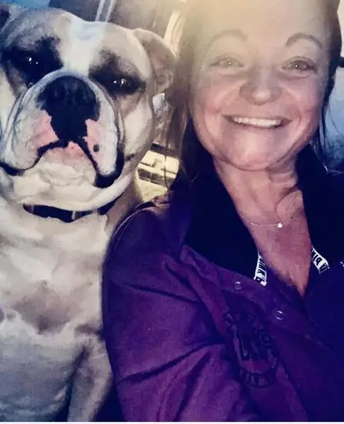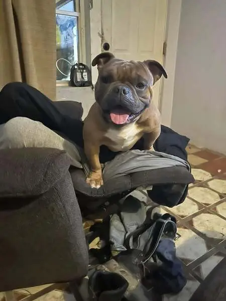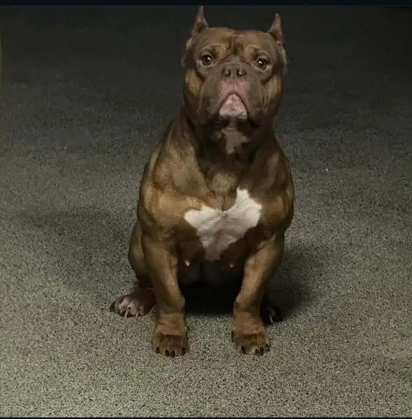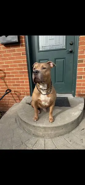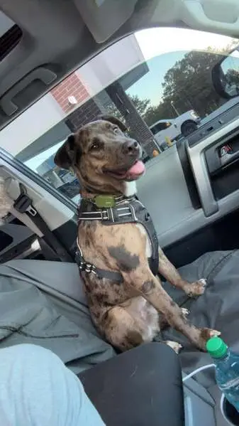 Brindle with white markings. Wearing a green camouflage collar with reflective stripe and brand Kong in red letters. Flexi classic retractable leash. Found at H and H Shooting Sports Store.