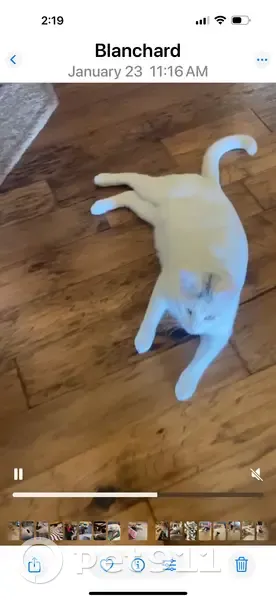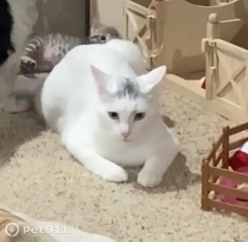 He’s white with a strip of grey between his ears. He has displaced shoulders so it makes him walk a little funny. His shoulder blades stick up higher than normal. He is very friendly but I’m sure he’s scared.