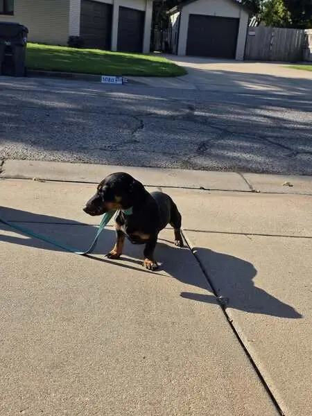 She is dark brown with light brown, was born with the end of her tail curled in so it looks like a hook at the end of her tail, she was first by hyvee on 119th then was on I-35 and 119th highway, animal control was able to pursue her off the highway but lost sight of her, last sighting was by 151st and Arapaho