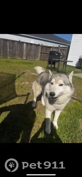 White with grey touches has a black spot in his tail, loves people and kids, very vocal when around other animals he was wearing a collar resembling the colors of an American flag and also a scarf around his neck
