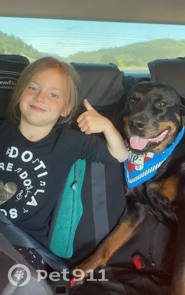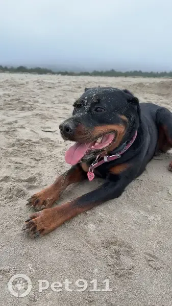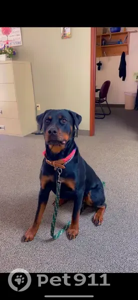 Rottweiler black/brown she is 4 years old and super sweet. She was wearing a bright pink collar with a pink heart dog tag. She disappeared from our yard.