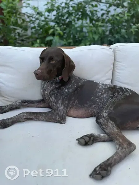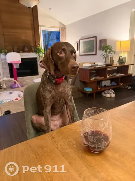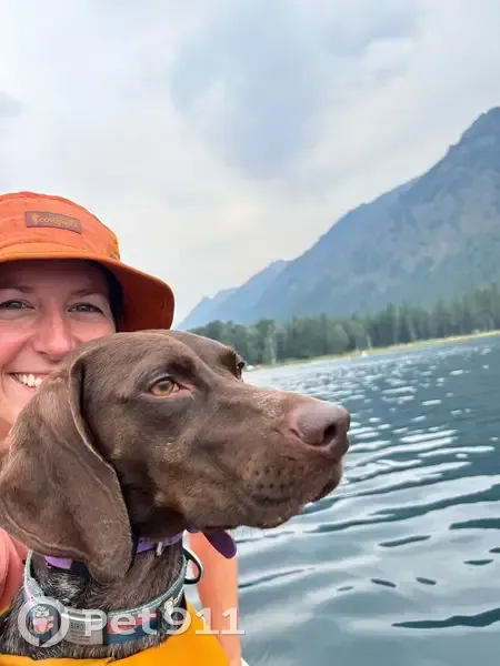 Birdie is a liver and roan mid-sized GSP at 45lbs. She has a large round brown spot on either side of her belly. She is wearing a teal coat, with a reflective orange vest on top as well as a purple shock collar. She was on a hike with me on the Mirror Lake Trail in Mt Hood National Forest, last seen about 1 mile in prior to the uphill switchbacks