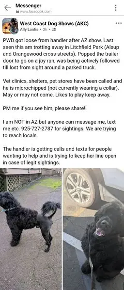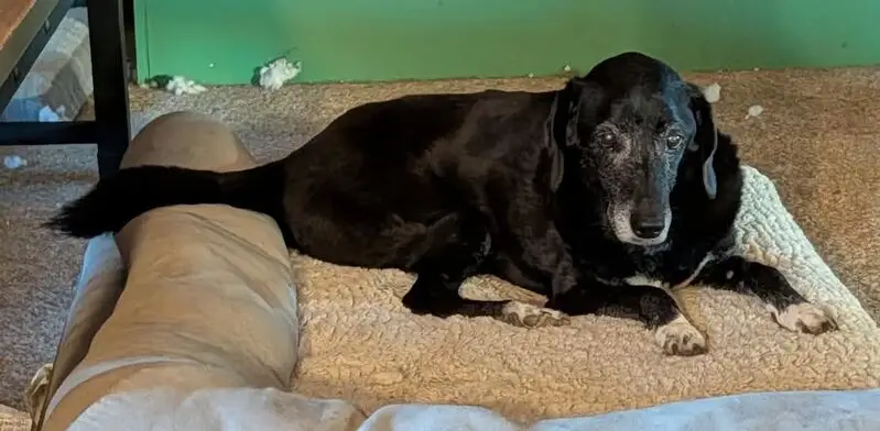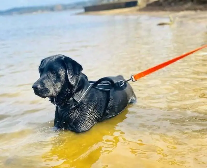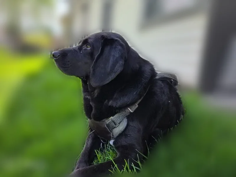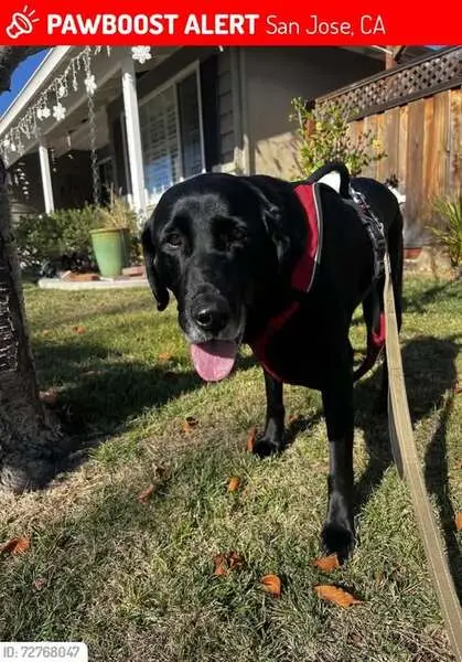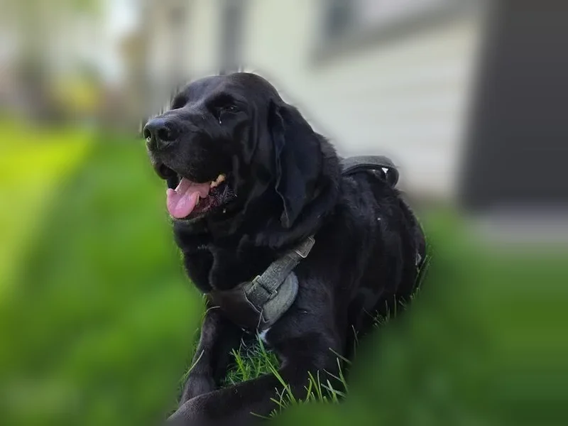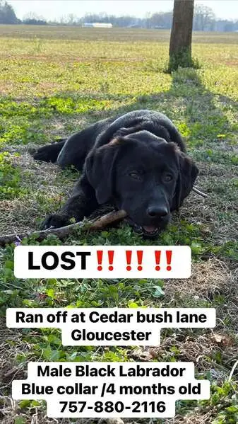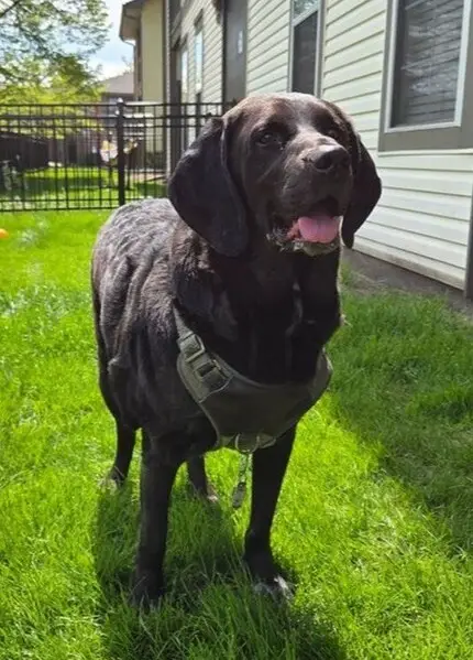 Black with a bit of white on paws and chest. Was wearing a greenish grey harness when found. He looks like a lab mix (maybe with beagle or basset). Appears to be a little older, guessing 5 years old or older and over 50lbs. Very friendly.