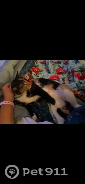 She is a calico. She has a split color face the right side is tan with black on the left. All of her paws are white along with her chest and belly. She is spayed but not microchipped. She also lost her collar before she ran away.
