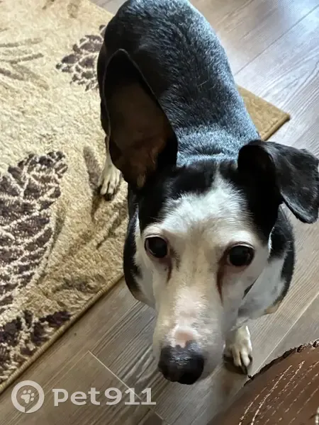 Mixed breed, dachshund/chihuahua/terrier,. Mainly white face, shiny black and white body, a little bit of brown. 20 pounds. Female, chipped. One ear stands up and the other lies down very often. She has been seen in the golf course. She escaped from my daughter’s home under the fence. She doesn’t like being away from home and she’s not very social. Best not to try to catch. She just runs away. Please report location. She howls at night. She got lost once before when she escaped from a groomer and we were told this. Someone also heard howling a few nights ago.