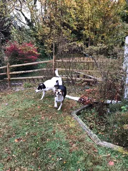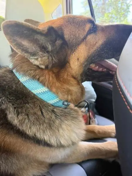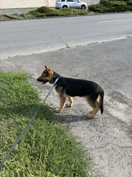 Brown and black short smooth hair. Sleek frame. A scar on her head and a few scars on her legs. She jumped our fence when we weren’t home. She becomes very anxious when it rains and even though we have a doggy door for her, she doesn’t like to be home alone without a human around.