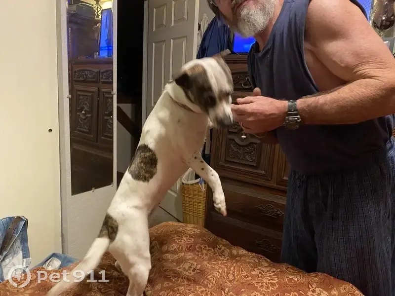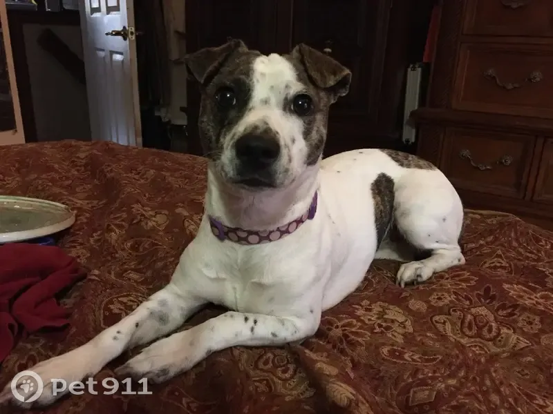 She is a Jack Russell breed. She is white based coat with brindle spots on her side and butt brown ears. White eyelashes on one eye black eye eyelashes on the other. She has a white spotted muscle the stripe up between her eyes. She escaped the pet babysitters home Off of Moonlight Drive in Houston Creek.