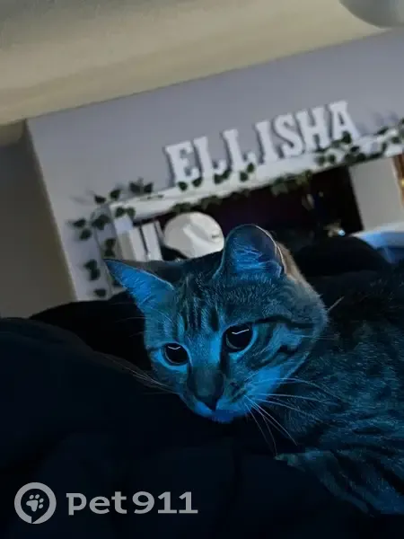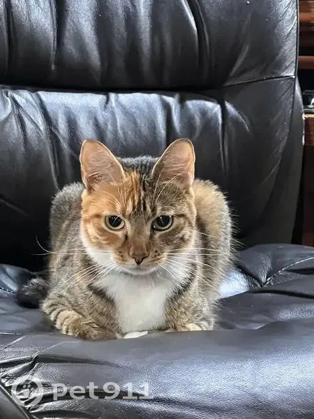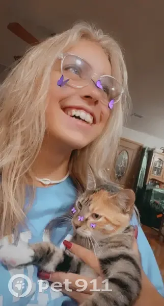 Multicolor, green harness on but might have fallen off. Knows her name and is so cuddly. She has a staple in the end of her tail I was getting removed. It’s also shaved half way.