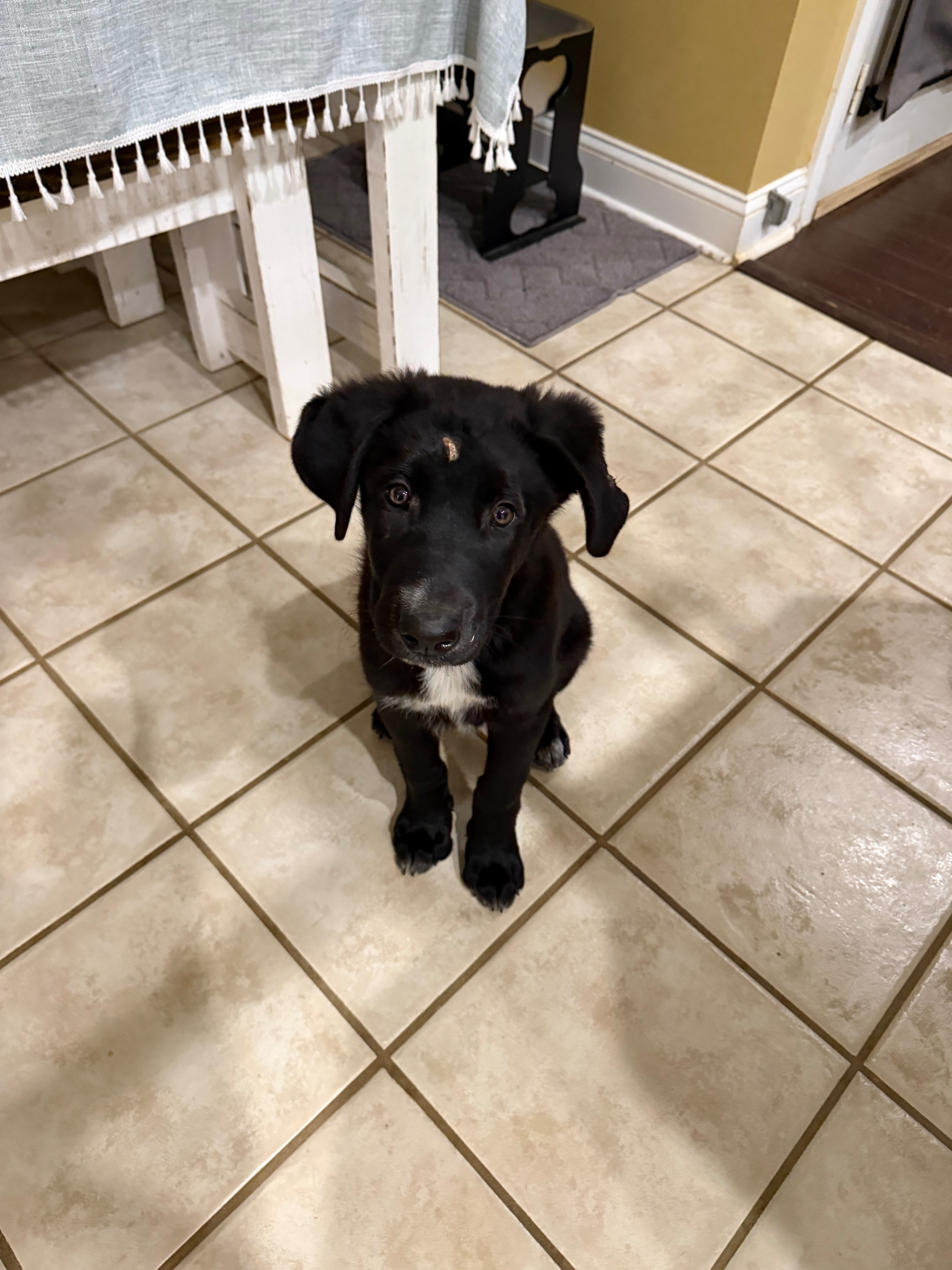 Approximately 10 weeks old. Has staples in left ear that were due to come out today. He is black with short hair. Has a small bald spot on his forehead. He has white markings on his chest and paws. He has light brown eyes. Looks like a lab. He is a lab and GSD mix. We were out of town and our sitter did not secure the front door and he walked out of the house approximately 4 am Saturday morning. We were able to pull up that footage. We have posted him on social media and called the vet clinics in our area.