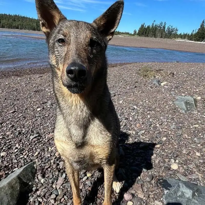 Rust/ Tan coat has a white speck of fur on snout and scarring on hind left leg. German shepherd. Skittish but warmed up to me pretty quickly.