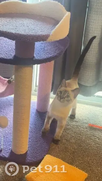 White fur w brown paws and tail, markings on face, blue eyes. He got out in the middle of the night from the front door that was accidentally left unlocked and our other cat opens doors.