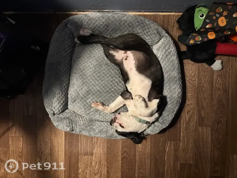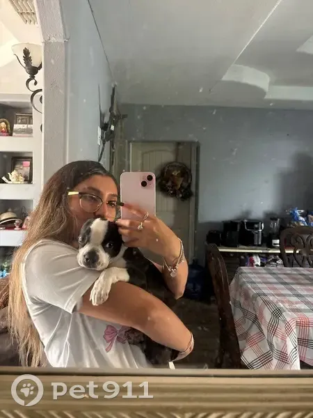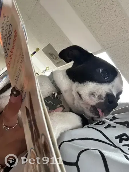 Pablo is a Boston Terrier he is black and white with brindle he’s roughly 5 months it looks like someone pushed down where we blocked off a hole from our fence or the possibility that he might have done it himself and someone picked him up because he normally never leaves the street