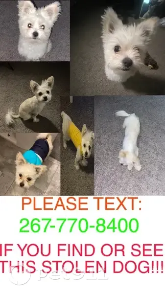 Ziggy is a small white dog with pointy ears and a slightly puffy tail. He’s young , friendly, and energetic!! Someone stole my car at the Exxon gas station on 4200 Whitaker avenue. Ziggy was inside of the car when It was stolen. We found the car the next day and ziggy was gone! The car was found at 1431-1464 s 25th street. If you see ziggy or someone with ziggy then please contact me and call the police. They could also be trying to sell him on Facebook marketplace, OfferUp , and Craigslist!
