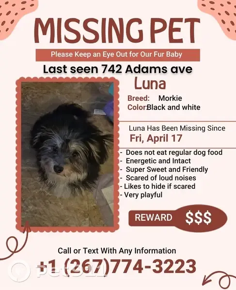 Luna is black and white small dog, friendly, does not eat regular dog food, she was last see with her sister and I got her sister back but she is still missing