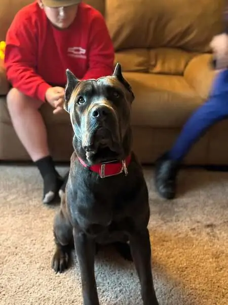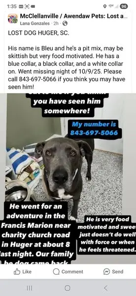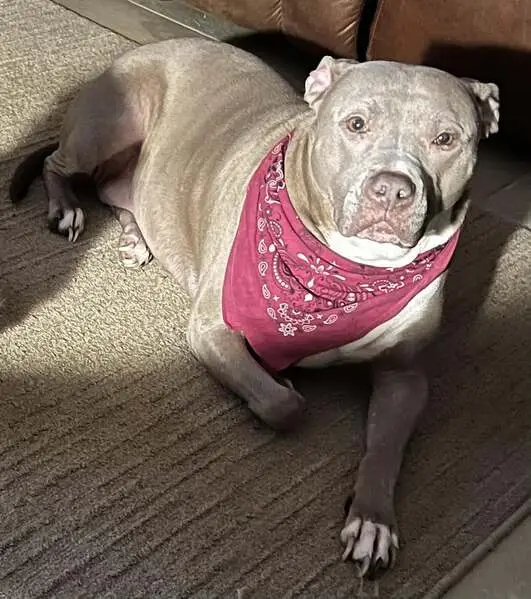 Gray and white female pitbull wearing a pink collar with no tag. Not chipped. Not fixed. Very sweet personality. About 3 years old - playful. Potty trained. And has been good with my kids.