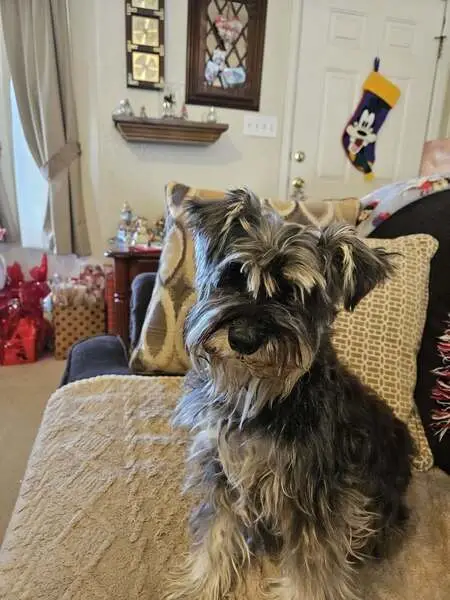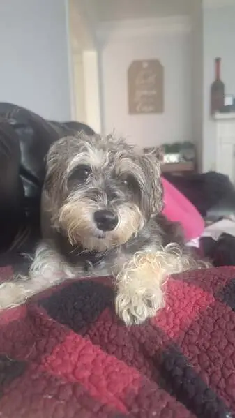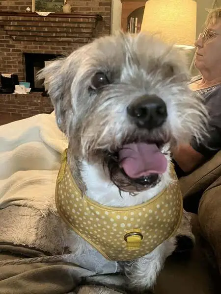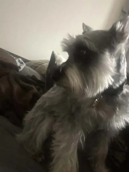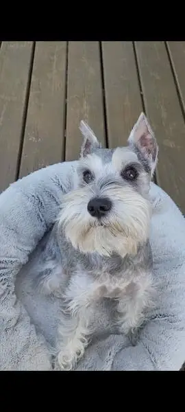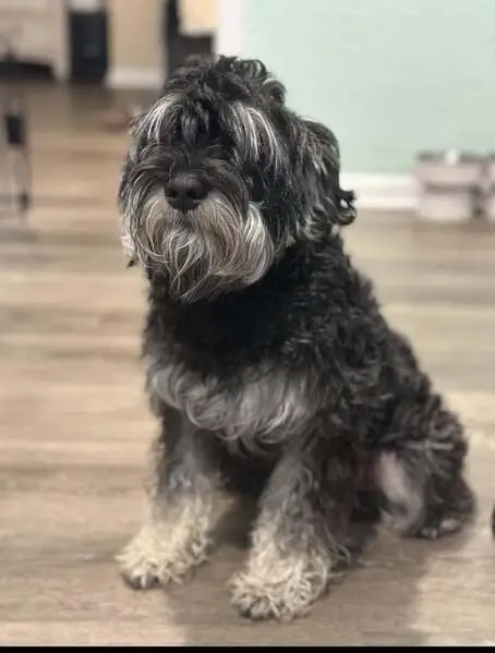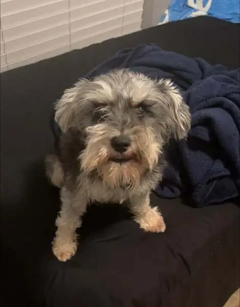 He was running across the street towards apartments. No color, no leash. Somewhat guarded, but friendly. He is grey and white wiry hair. Looks like a schnauzer and is young.