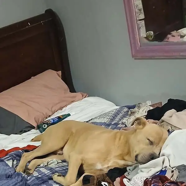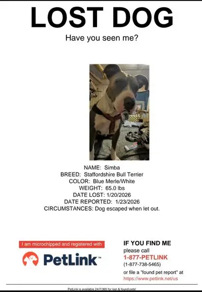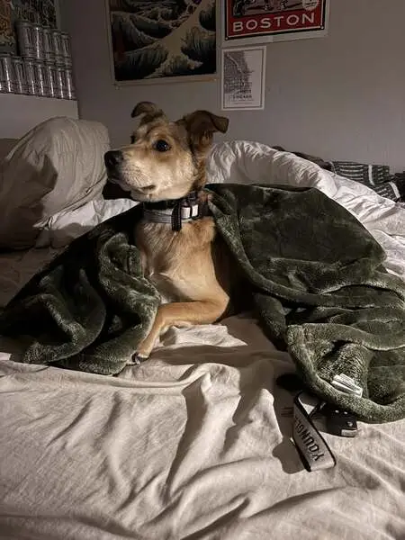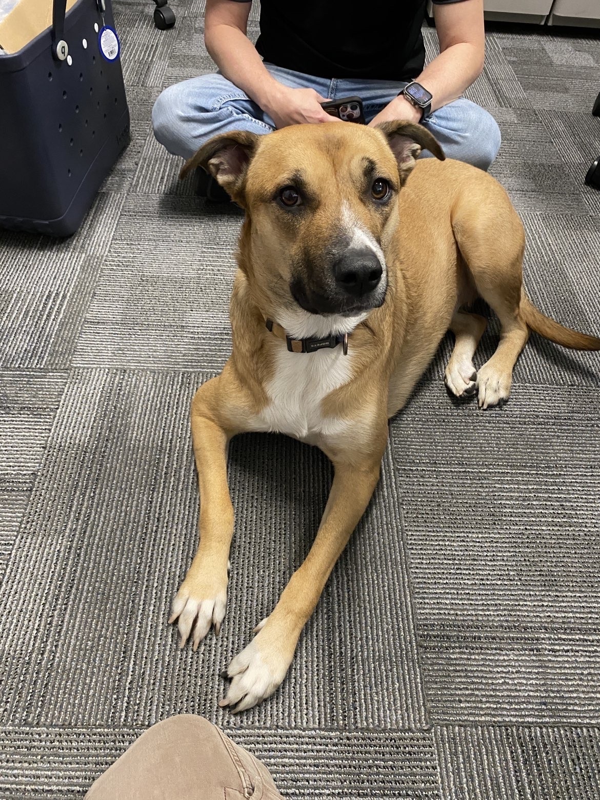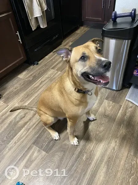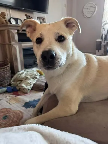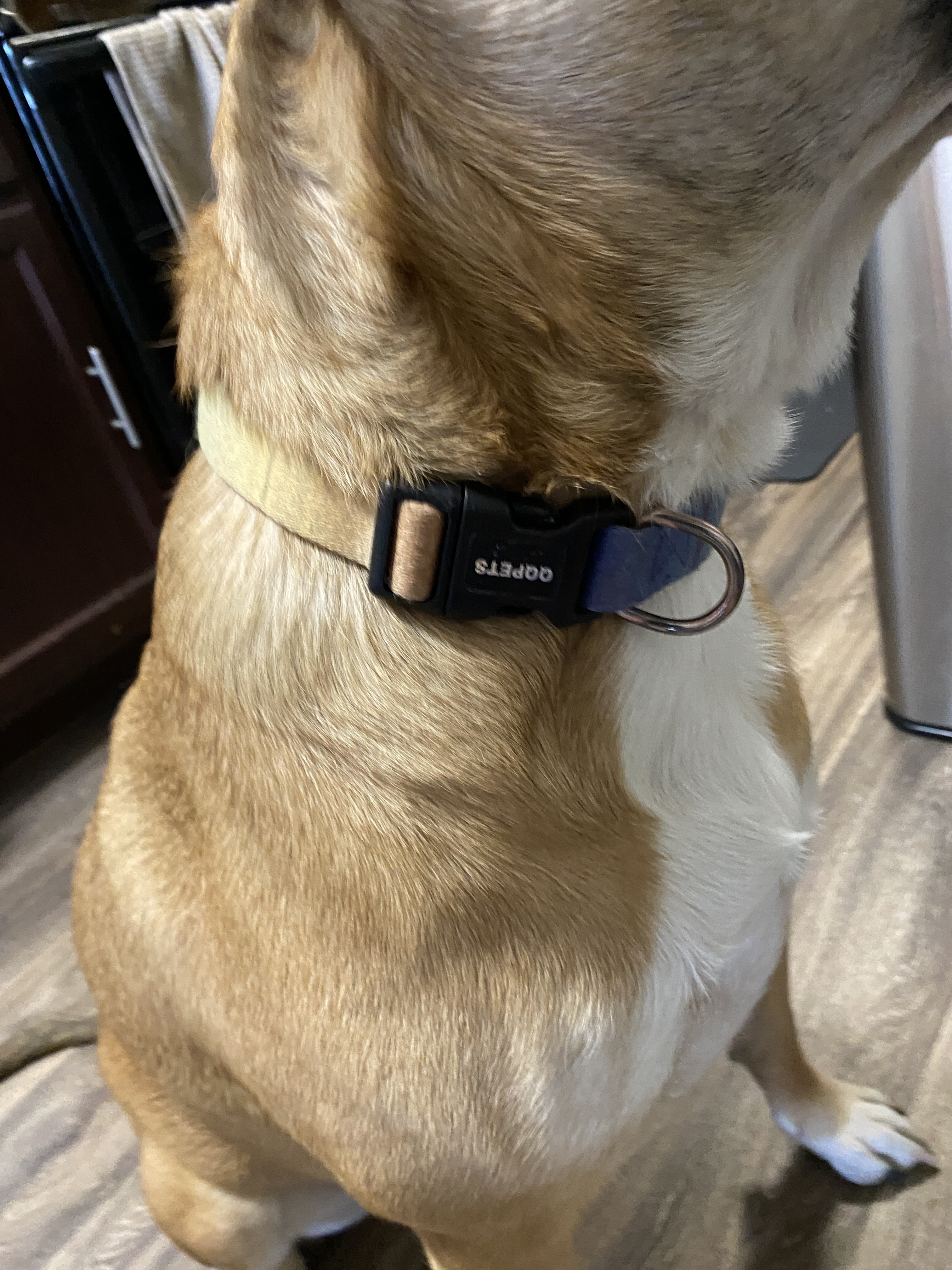 Large recently spayed female, tan with black points and white on nose and chest, one black claw on front right paw, dewclaws intact, black hairs on top of tail, brown eyes, wearing blue-green gradient collar