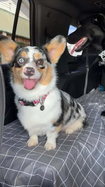 Possible corgi mix. Almost ran over her with my car, but my son saw her. Opened the door right before the was about to run into the desert, she turned around and ran right into the car. Super sweet and friendly.
