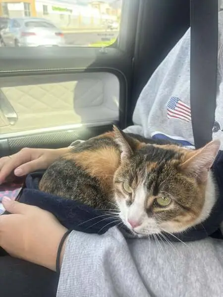 It's gray with white and has black lines, my Gatica is very shy, she has a black necklace with white rays, please it got lost on the sides of Hurley Ranch
