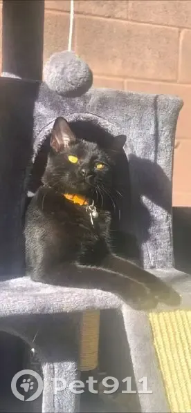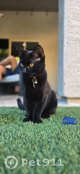 Olive is pure black with black whiskers. He is petite size. 7 months old. He is neutered and chipped. He was adopted from Halo in early July. He is timid and hates loud noise. We think he slipped out when a dog came into the house and we accidentally locked him out for the night.