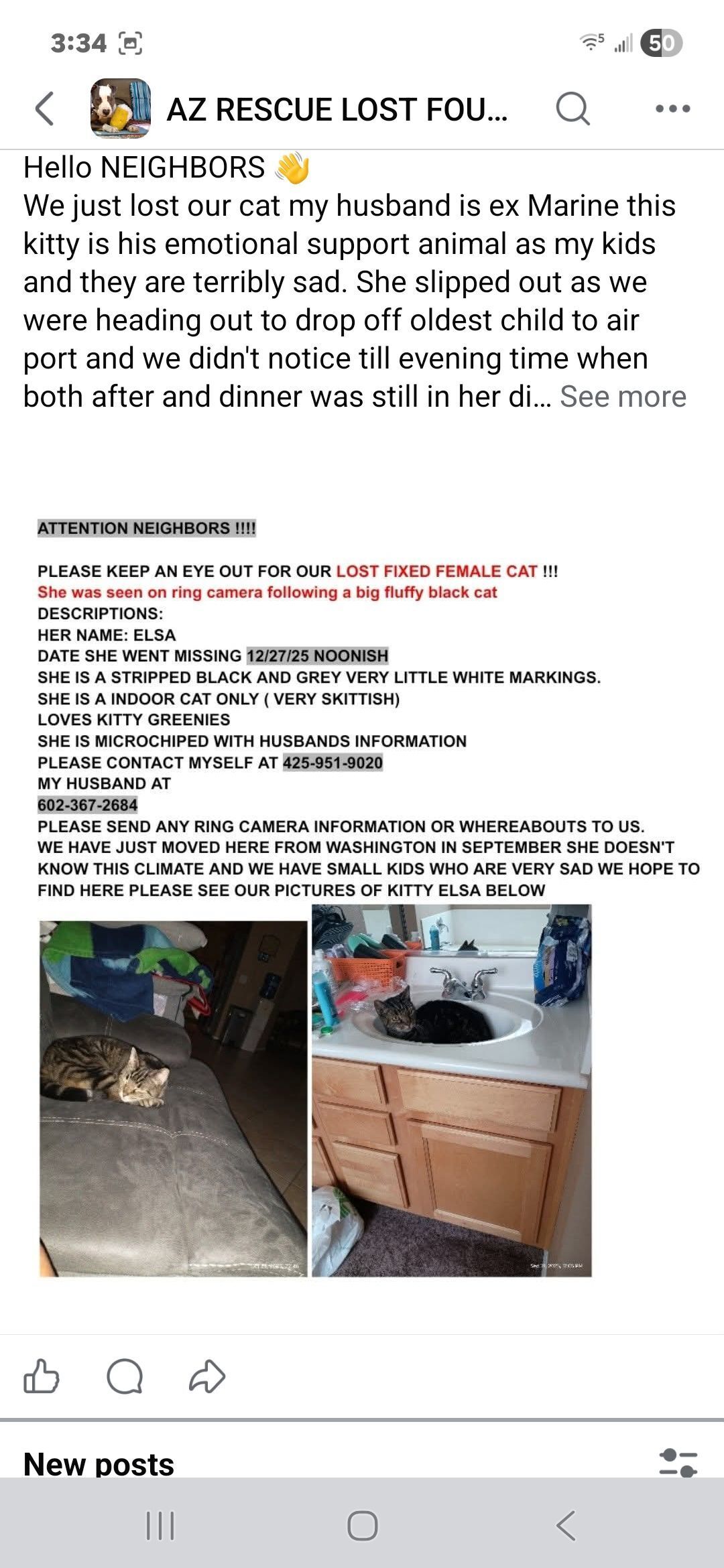 She is a Grey and black fixed female cat she is a rescue very skittish and MICROCHIPED with Husband information she is sweet and missed she is a support animal for my husband who is ex Marine and for my children. We just moved from Washington she doesn't know the area.