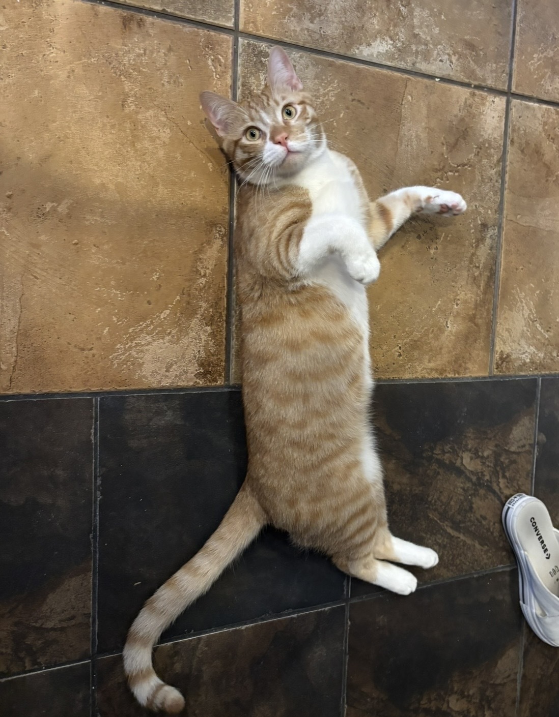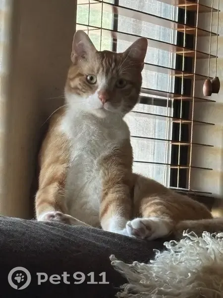 He is an orange and white cat with green/yellow eyes. He has orange stripes and a white belly and feet. He can be loud when comfortable but since he is in a new territory he may be frightened. We arnt sure how he got out but he does love exploring and hunting bugs so he may be wandering around your backyard so please keep a look out for him.