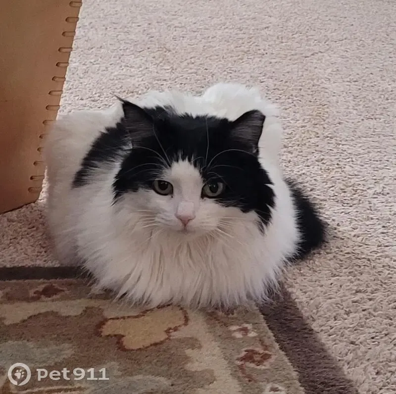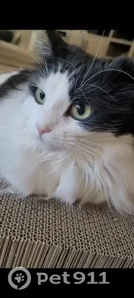 Beautiful inside cat, clipped left ear, all white with black tail, partial black face and one black spot on her back. She accidentally got outside.