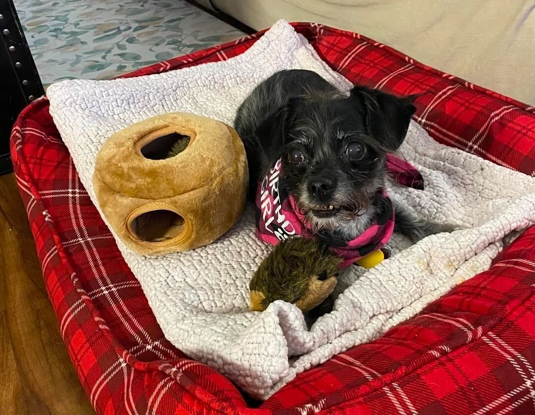 Britain aka "Britty", is a small black terrier/chihuahua mix dog. She is skittish, anxious, has a sensitivity to load noises, and is frightened by new people in particular men. Approach with caution as she has a tendency to run. I was watching Britain for my sister while she was on vacation. When I opened the front door to get a box on 12/23, she snuck out without me seeing her. She was seen going north in the walking path on 10th street between butler Dr and Alice Ave. Some people reported seeing a little black dog in the Palma park on 11th st between Dunlap ave and Townley ave. We believe she may still be in the area. The on/off rain has made it difficult. Any information is helpful.