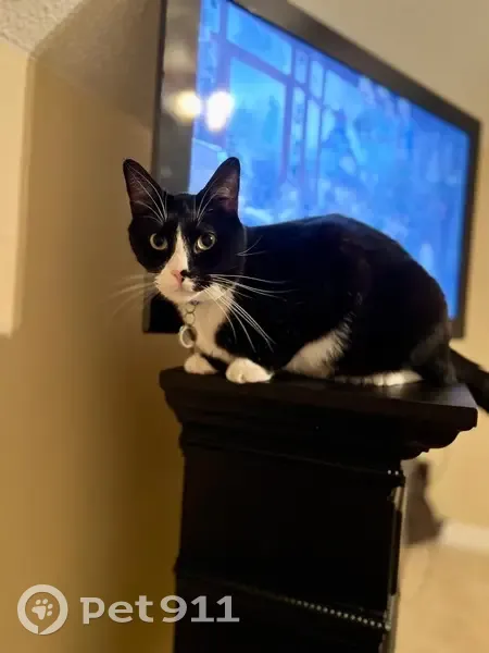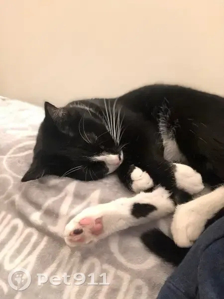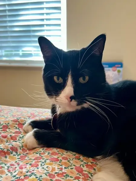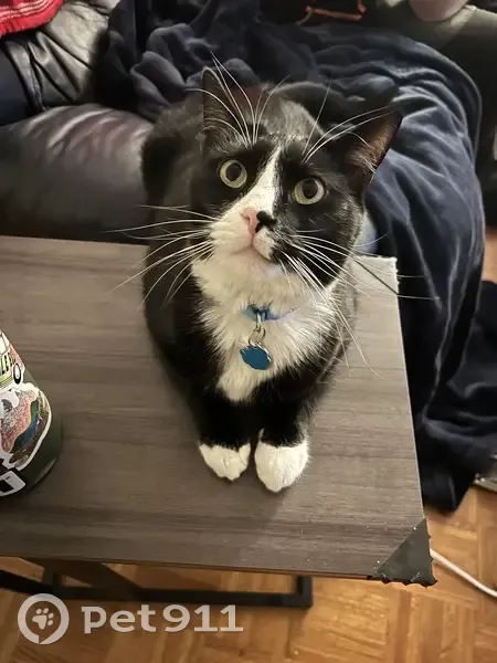 Winter snuck out of our house in Villiage Acres between 10am and 12:30pm on 11/7. He has a tuxedo color with white coming to a point between his eyes, a black and pink nose (black on his left, pink on his right,) and white paws with a black spot on the back of his back right paw. He has a blue breakaway collar with his rabies tag and name tag. The opposite side of the name tag says "If I'm outside, I'm lost" with my phone number.