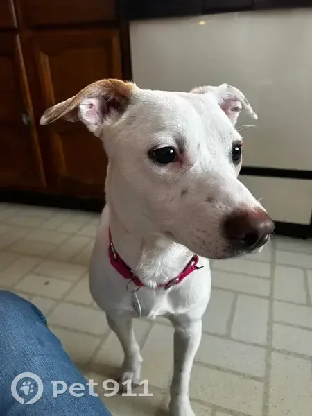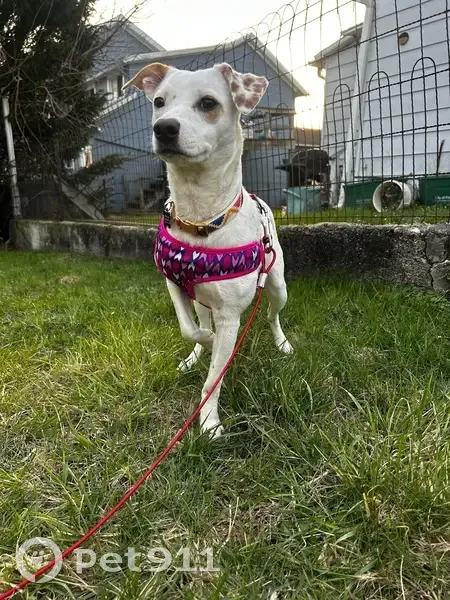 White fur with light brown spots. Ducky is afraid of males and very skiddish around people and loud noises. She is 9 months, she is in her adolescent phase, so she is even more easily frightened. Do not approach her fast. She got scared of my husband who was trying to let her out, bit him lightly and ran out in between his legs as he was trying to hook on her leash to let her out.