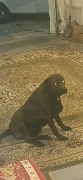 Black lab mix with white chest, white on her snout and white eyebrows, approximately 40lbs. Wearing a tie-dye collar with a device for invisible fence.