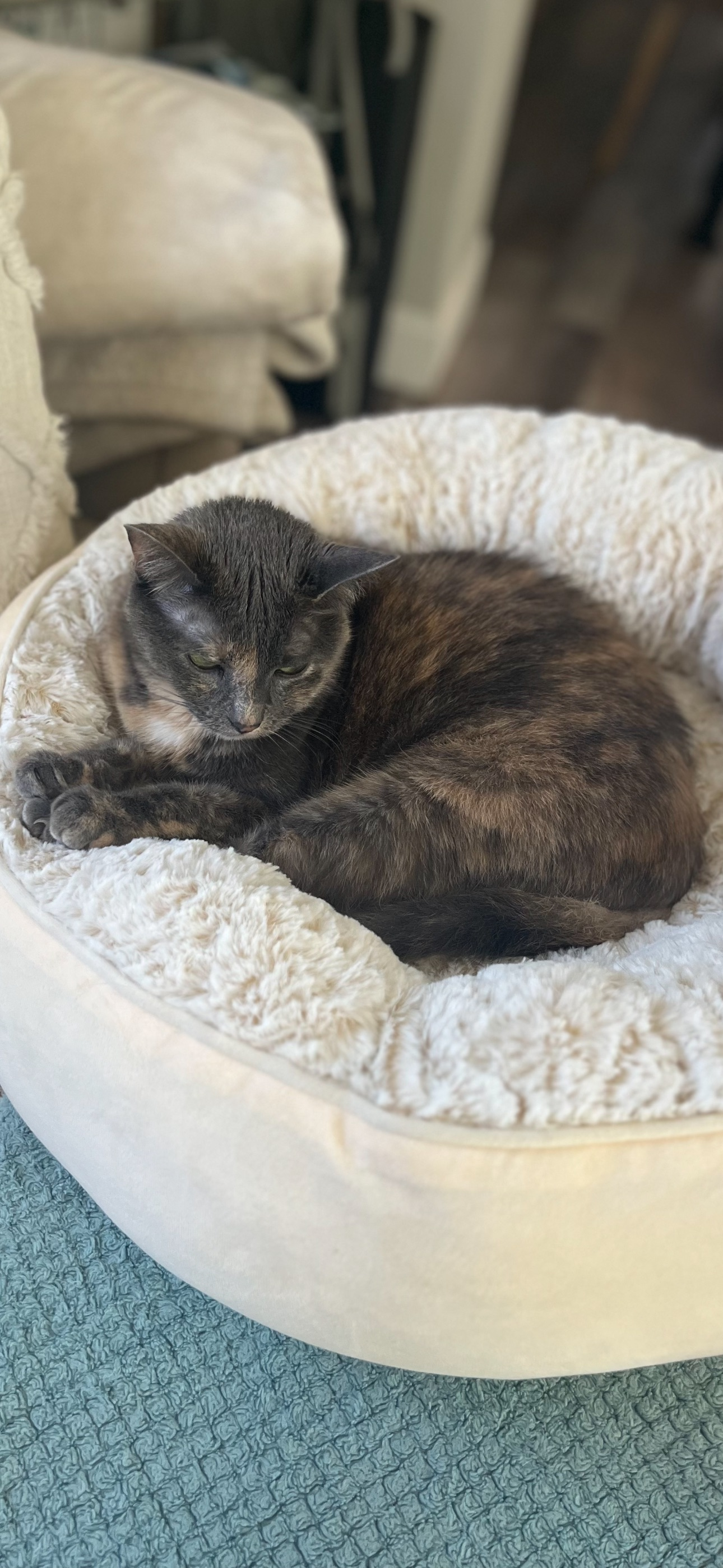 Dilute tortie, light grey, white, and peach. Small girl with a peach patch over her right eyebrow, left lip, and in the middle of her nose. Larger white and peach patch on her chest.