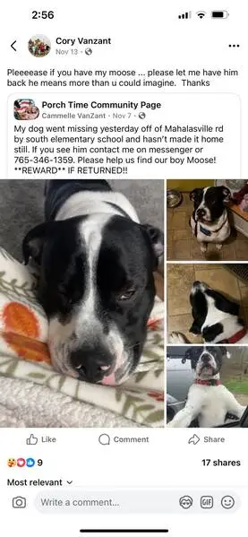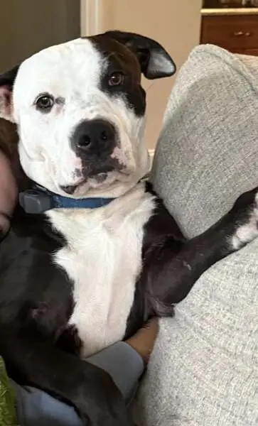 Found grey and white young female pittie mix Running alongside the road on Old Millersport Rd near Pleasantville Rd. She was a little timid but hopped up in the car, rides in the car well. She wasn’t wearing a collar when I found her, we put one on her to take her to get scanned for a chip. She is not chipped. She’s very sweet and a bit skittish.